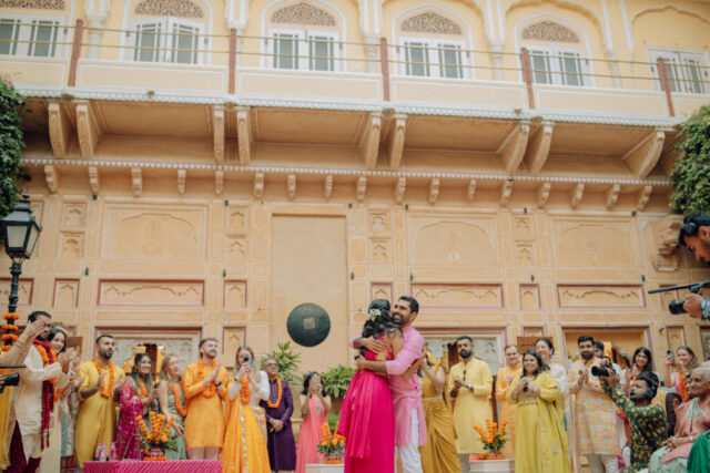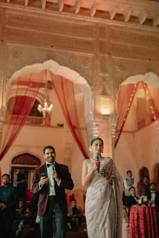 The mandap stood beautifully adorned, framed by Samode’s timeless architecture. As guests took their seats, the atmosphere shifted, it felt sacred, intimate, and emotionally charged all at once.